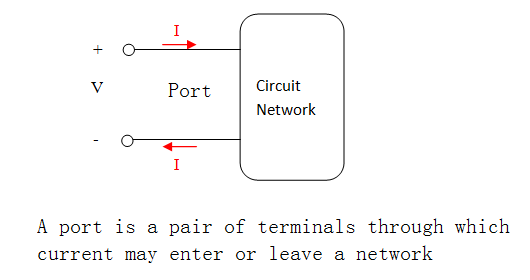 A port is a pair of terminals through which current may enter or leave a circuit network.