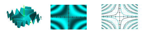 The complex function z = f(x,y), can be graphed, over some finite domain, as the height of a 3D surface, a density plot, or a set of contour lines.